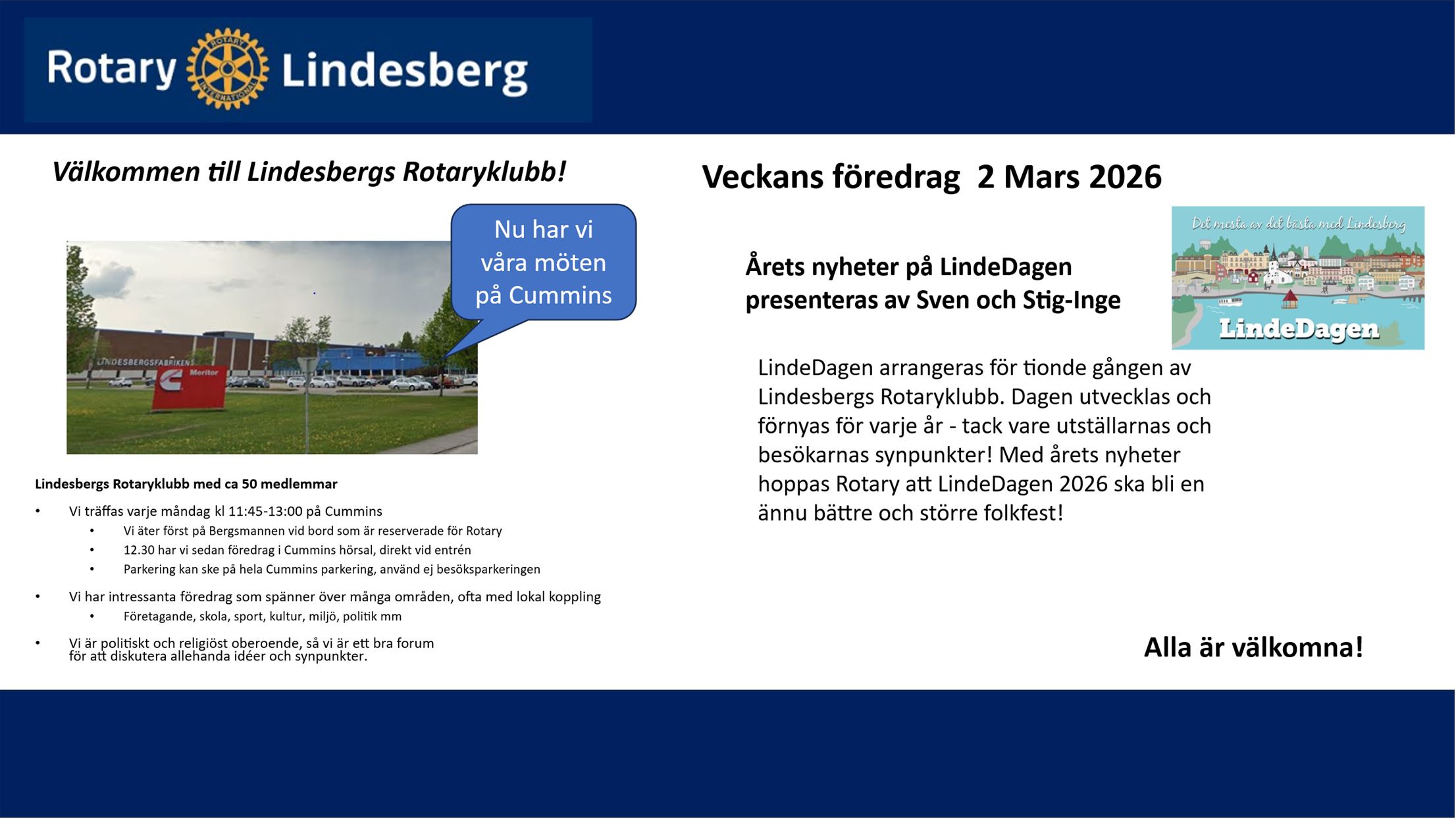 Lindesbergs Rotaryklubb har c:a 50 medlemmar och vi träffas varje måndag kl 11:45-13:00. Vi har olika föredrag från alla möjliga branscher vilket ger dig en bra insikt ur andras verksamheter än din egen. Vi är politiskt och religiöst oberoende så vi är ett bra forum för att diskutera allehanda idéer och synpunkter.