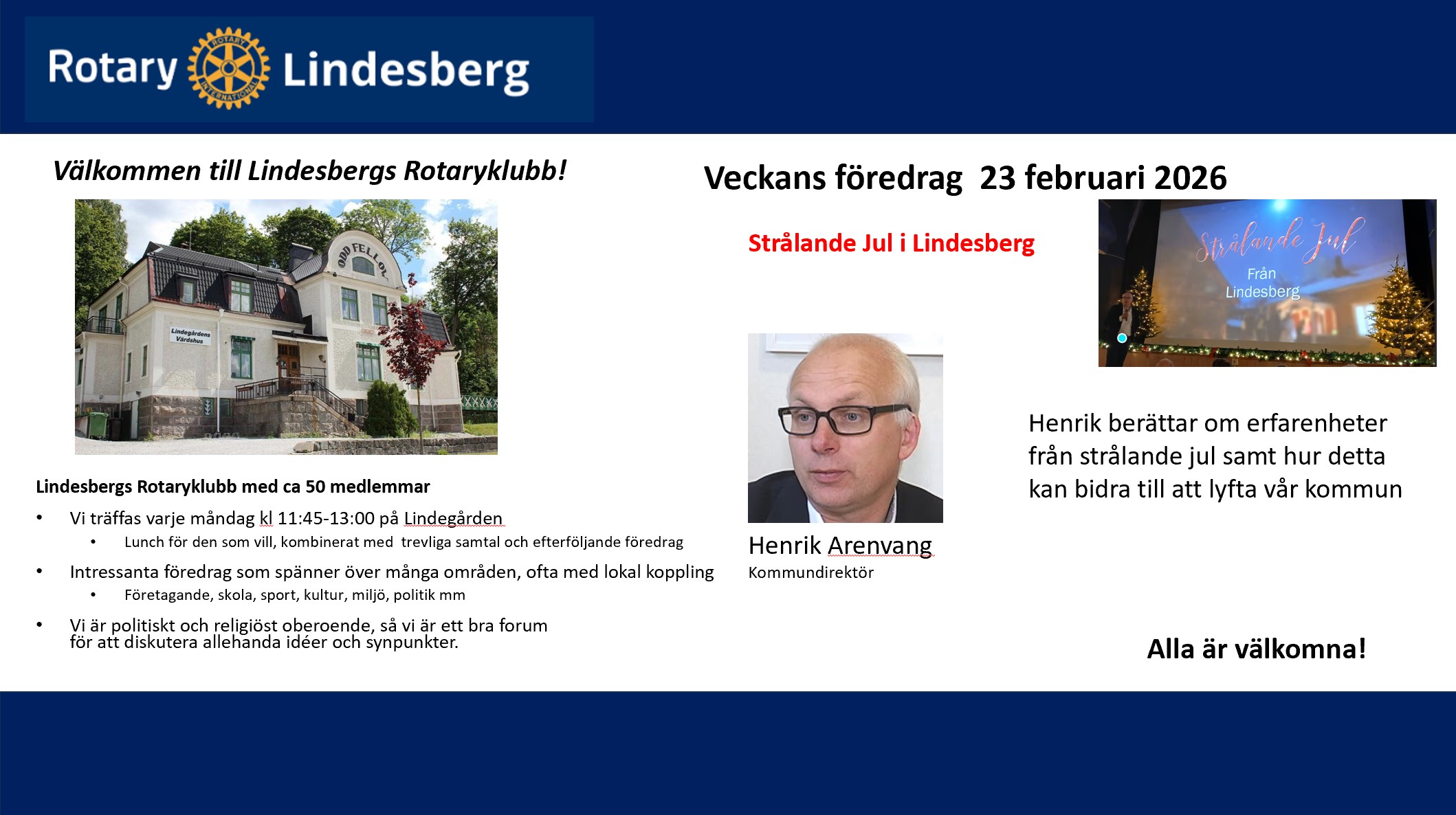 Lindesbergs Rotaryklubb har c:a 50 medlemmar och vi träffas varje måndag kl 11:45-13:00. Vi har olika föredrag från alla möjliga branscher vilket ger dig en bra insikt ur andras verksamheter än din egen. Vi är politiskt och religiöst oberoende så vi är ett bra forum för att diskutera allehanda idéer och synpunkter.